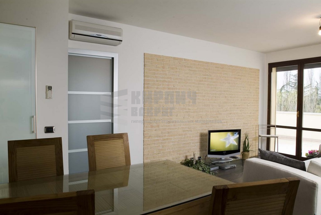 Жёлтый кирпич с мелким песком даёт облицовочной поверхности сходство с облицовкой из кирпича без песка, создавая эффект кирпича вырезанного в камне.